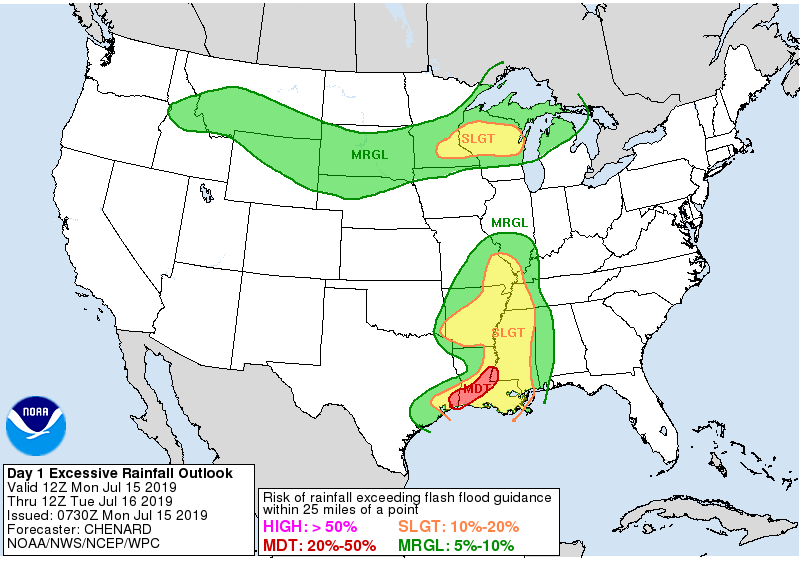 It's certainly more humid this morning across NW Harris County than it has been the past several day. I see locations just North of Cleveland picked up 3 to 5 inches in a skinny band of storms early this morning. Still a chance of some rain today and we do have a Marginal/Slight/Moderate Risk for Excessive Rainfall today, but we should settle into a more benign July pattern this week. Daily chances of seabreeze showers and storms will be the theme as an onshore flow re establishes this week in the wake of Barry. A July heat wave sets up for the Mid West and the Mid Atlantic as we look to remain in a mostly Easterly flow beneath that sub tropical ridge. There are some indications that a weak frontal boundary may sag into our Region early to mid next week. If that does occur, look for some increase for rain chances. I see no other tropical mischief brewing at this time across the North Atlantic Basin.