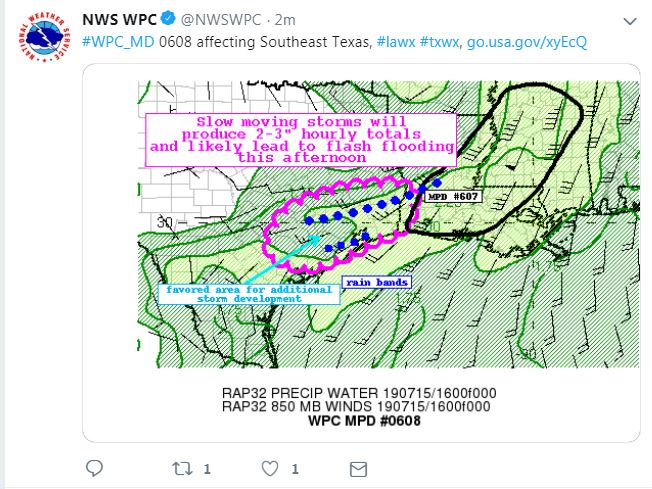 srainhoutx wrote: Mon Jul 15, 2019 7:59 am It's certainly more humid this morning across NW Harris County than it has been the past several day. I see locations just North of Cleveland picked up 3 to 5 inches in a skinny band of storms early this morning. Still a chance of some rain today and we do have a Marginal/Slight/Moderate Risk for Excessive Rainfall today, but we should settle into a more benign July pattern this week. Daily chances of seabreeze showers and storms will be the theme as an onshore flow re establishes this week in the wake of Barry. A July heat wave sets up for the Mid West and the Mid Atlantic as we look to remain in a mostly Easterly flow beneath that sub tropical ridge. There are some indications that a weak frontal boundary may sag into our Region early to mid next week. If that does occur, look for some increase for rain chances. I see no other tropical mischief brewing at this time across the North Atlantic Basin.