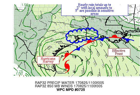Expect 25 to 35 inches of rainfall from today to whenever Harvey finally exits our Region with some isolated totals much higher depending on where the training feeder bands set up. Those feeder bands are capable of dropping 3-5 inches per hour, but it will be impossible to determine too far in advance exactly where and which neighborhoods will be impacted. Those estimates may still be on the conservative side via the WPC/NWS.