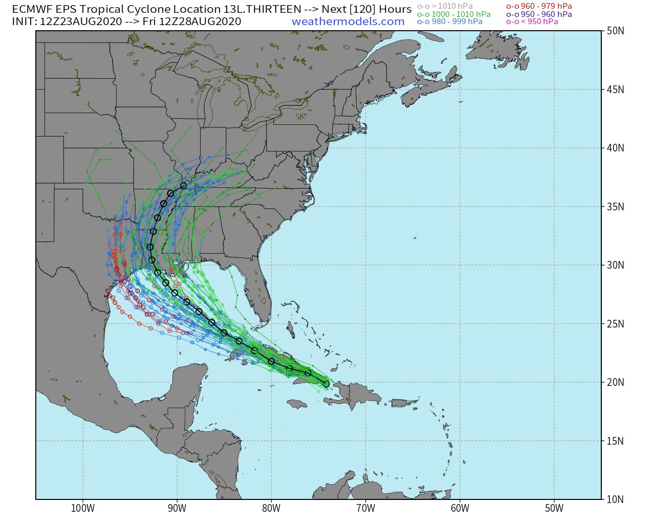 May be a silly question but what are the black circles?don wrote: ↑Sun Aug 23, 2020 2:45 pm 12z EURO ensembles.. Notice how the stronger solutions take Laura along the coast of Cuba while the weaker solutions take Laura inland through Cuba. Which causes more disruption to the storms core.And like previous runs the stronger solutions have Laura more west into the middle to upper Texas coast.
