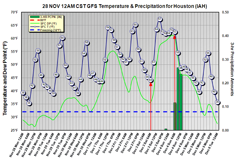 Still quite a ways out to be certain, but it currently looks like return flow off the Gulf begins late next Thursday. That means warming temps and increasing clouds for TX on Friday. Probably highs in the 70s by Friday. Lows in the mid to upper 50s Saturday with highs in the 72-75 deg range. Cloudy. Maybe a few light sprinkles around. Possibility of a weak reinforcing cold front on Sunday morning, but I have little confidence in the model output that far out as far as that front.redneckweather wrote:wxman, I'm heading out on Dec 2nd and staying thru the 4th (Sunday). Thanks!!