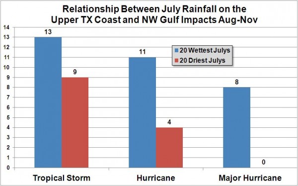 Chris Hebert of Impact Weather recently completed a study looking at the effects of the top 20 wettest and top 20 driest July’s and the impacts of tropical activity on the upper TX coast in August-November of that year. The results are seen in the graphic below and are fairly dramatic. For the 20 wettest July’s, 13 tropical storms impacted the NW Gulf following that wet July versus 9 in the top 20 dry years. Even more astounding is that 11 hurricanes impacted following a wet July with only 4 in the dry years and 8 major hurricanes impacted the NW Gulf versus none following a dry July. To sum up the data following a wet July, there is a greater than 50% chance a hurricane will strike the TX/LA coast.