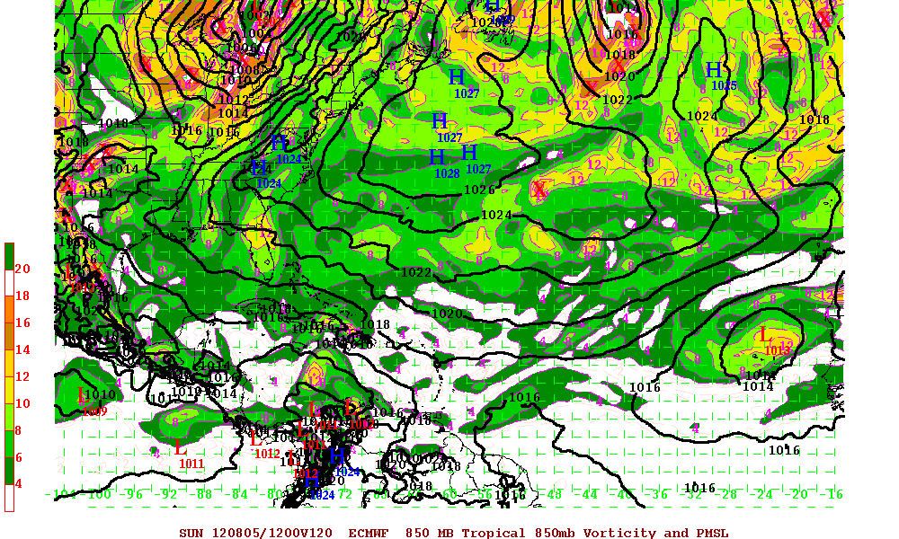 The GFS along with the Canadian have been rather robust suggesting development of the disturbance also known as Pouch 10 by the Montgomery Group. The 00/06 Z GFS insists that 850mb vorticity increases as the system nears the Caribbean Islands in about 100 hours at a fairly low latitude and traverses to Caribbean. We will see.
