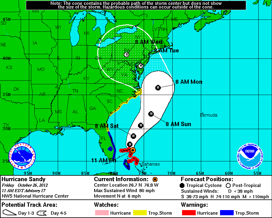With the trough anchored over the SE US and mid Atlantic producing an increasingly strong SE steering flow and blocking high pressure over Greenland, Sandy has little choice but to turn back toward the NW or even WNW and strike the US coast. A hurricane has never struck the US mid Atlantic or NE coast moving toward the NW or WNW or at a right angle to the coast as Sandy is forecast to do. Historical storms generally move SW to NE parallel to the coast with the greatest impacts offshore or over extreme east MA and Cape Cod.