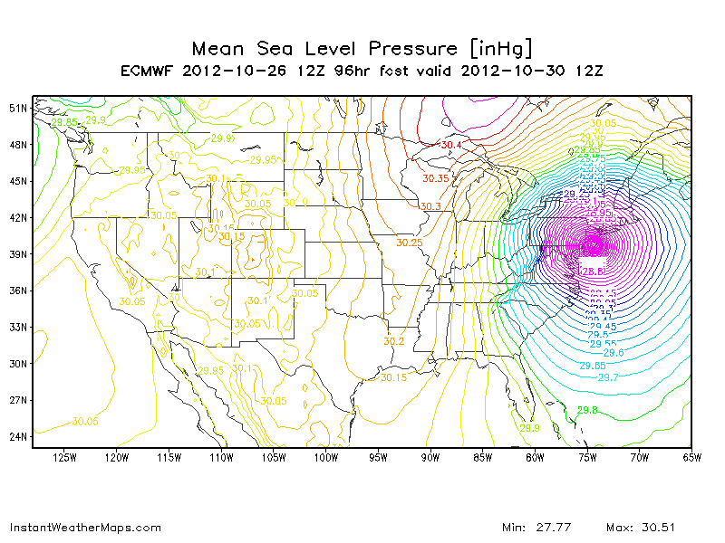 As for intensity, Sandy is gradually taking on more and more mid latitude influences although her center core remains “warm” or tropical. Jet stream phasing with the system is starting to occur with temperature gradient developing on her outer flanks of the large circulation. As Sandy moves northward this process will intensify has the warm Caribbean air mass clashes with a very cold polar air mass resulting in strong baroclinic intensification. Sandy will also be located in the favorable region of the trough and jet stream axis to promote surface deepening of a cyclone. Models continue to advertise “incredibly” low pressures with the ECMWF showing a record 942mb low near landfall on the New Jersey coast which is an astounding 30mb lower than the 1991 Perfect Storm and 6mb lower than anything ever recorded in the NE US.