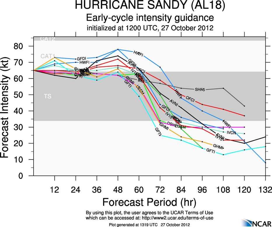 As far as the models predicted track go, they are doing a good job with a rare pattern with only modest amounts of spread. Generally the ECMWF continues to be on the west and southern edge of the guidance taking Sandy into the southern DELMARVA area while the GFS and CMC are further north into Long Island (NYC) and southern New England. The current NHC forecast track is splitting the difference with slightly more weight toward the ECMWF which was the first model to predict this “highly anomalous event” and has remained very consistent over the past 2-3 days.
