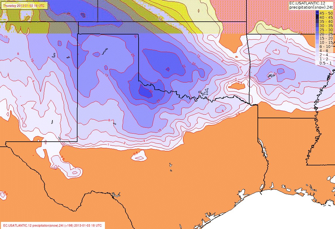 Here's the 12Z Euro 24hr snow accumulation forecast for Jan 2-3 (18Z). Note that the values indicated are in millimeters of liquid, so you have to convert. Figure 25mm = 1" liquid = 10" snow. So each 5mm = about 2" of snow. Obviously, this is nearly 10 days out so don't believe it 100%. Nothing is indicated for SE Texas. Not impossible, but it's unlikely we'd see any snow here.