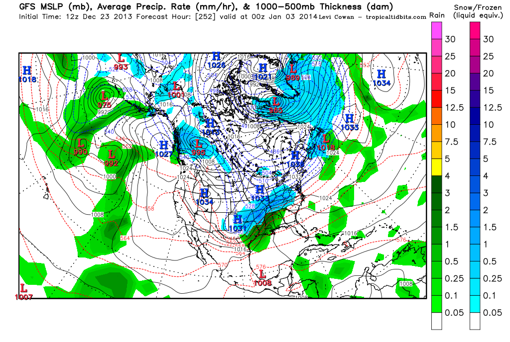 I know there is a lot of chatter concern what we may expect later in the upcoming week into next weekend. The Global ensemble and deterministic guidance continues to struggle with the -WPO/-EPO/-AO telecommunications regime and what the sensible weather will be regard this pattern change. The operational Euro dropped a very deep trough into the Western/Central US yesterday with its 12Z run while the 00Z GFS was depicting a 1065+ mb Arctic High settling into Montana only to loose it with the 06Z output. The 12Z GFS is back to a deep trough pattern with a 1050+ mb Arctic High and a deep Western/Central trough delivering much colder air well south into the Western 2/3rds of the Continental United States. Canada remains very cold, so our source regions are certainly capable of delivering a cold shot into our Region. The New Year appears to start very unsettled with a front arriving Thursday with perhaps a much colder front arriving next weekend. We will see.