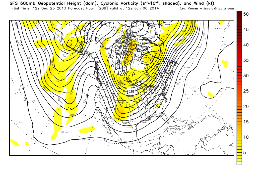 The forecast from New Years Day into mid January is trending to that of what we saw in late November/early December where a –WPO (Western Pacific Oscillation)/-EPO (Eastern Pacific Oscillation) regime where heights were high across the North Pacific/Gulf of Alaska due to the unusually warm waters across the Northern Pacific ushered in much colder air into the Western 2/3rds of North America and brought much below normal temperatures with a stormy pattern as strong/potent upper lows and a noisy sub tropical jet brought bouts of wintry weather across our Region. The PNA (Pacific- North American Oscillation) is forecast to relax back to a more neutral or slightly negative state which is what happen when we were very chilly early in the month of December where a persistent trough developed across the Great Basin/Inter Mountain West and into the Plains while the East Coast saw a stout Ridge and kept that area warm with above normal temperatures. The fly in the ointment is the AO (Arctic Oscillation) which is currently forecast to drop into negative territory which tends to have major effects of the location of the Polar Vortex near Hudson Bay. The Global ensembles have been hinting that the PV will shift back W and S, or to the West of Hudson Bay. Currently our source regions of Eastern Alaska/NW Territories of Western Canada are witnessing temperatures of -50 F or about 10-20 F colder than what we saw early in December. The telecommunication indices tend to raise an eyebrow as those indicators we look to suggest a more favorable pattern for a return of chilly weather into our Region.