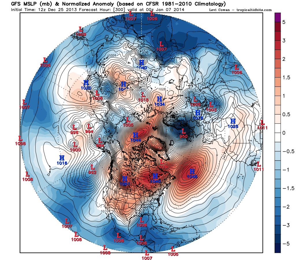 After a quiet and cool pattern since Christmas there are growing indications that a very chilly and possibly stormy pattern is ahead as we begin 2014. The Global deterministic and ensemble guidance is suggest a significant pattern change ushering in much colder air into our Region as a -WPO (Western Pacific Oscillation)/-EPO (Eastern Pacific Oscillation)/-AO (Arctic Oscillation) regime develops some what similar to the Weather Pattern we witnessed in late November/early to mid December where temperature departures of -20 to -30 degrees were commonplace and extended cold entrecched our Region for several weeks. A very strong Arctic Front looks to arrive next weekend.