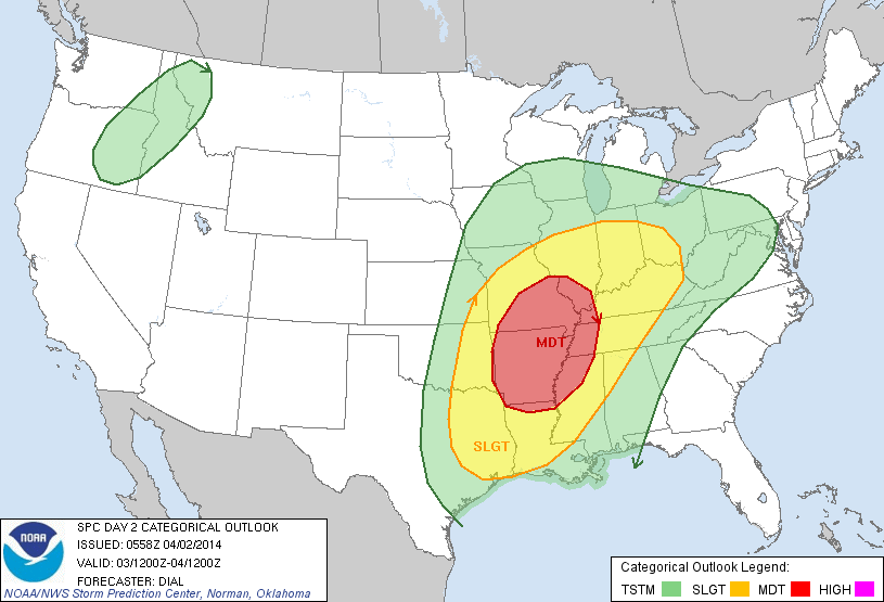 A warm, cloudy, muggy, and windy day ahead for SE TX. A slight chance for showers tonight and again Friday while a 30% chance of thunderstorms will be possible Thursday and Thursday night as cold front moves across SE TX dropping highs back down to the mid to low 70s Friday through the weekend. We could see some strong to possibly severe storms tomorrow. First glance of the weekend looks to be potentially wet as the warm front pushes back N and coastal forms near Galveston Still several days out but rain chances of 40% may be increased. The big weather story today through Friday will be the severe threat as yesterday was just the beginning of active severe weather and storm chase days. Thursday will bring a significant severe weather event for the Southern Plains through the middle and lower MS Valley, TN Valley and OH Valley as the SPC has upgraded the slight risk area to a Moderate risk. Today's slight risk includes the Central US into the middle and lower MS Valley. Portions of NW and N TX in the slight risk today while tomorrow the eastern half TX will be included. If you are out storm chasing the next several days be safe.