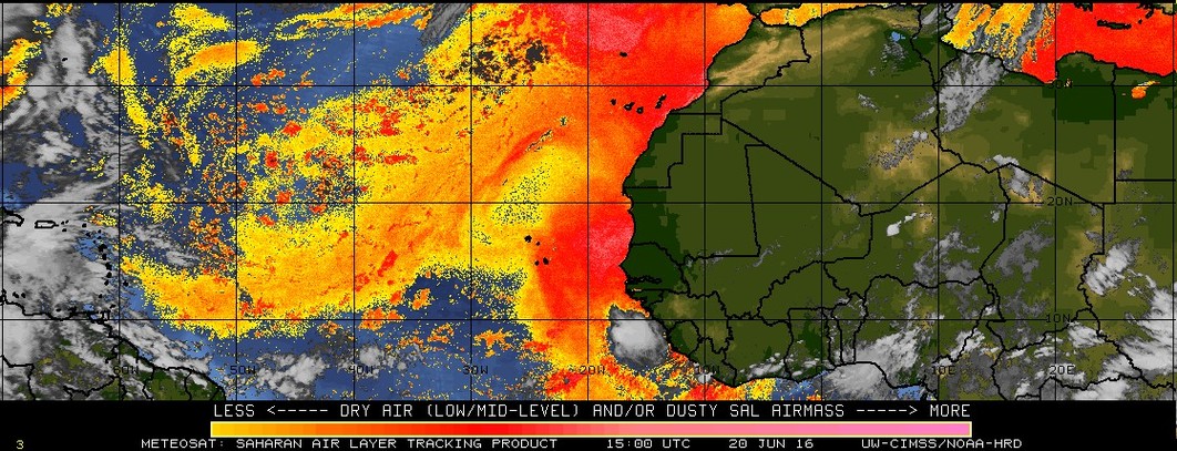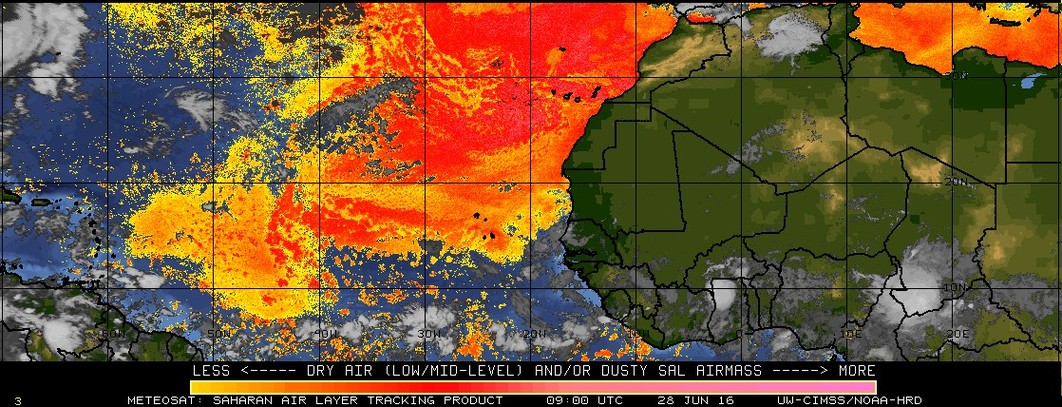 While the SAL (Saharan Arid Layer/African Dust) and sinking air due to High Pressure across the Eastern Atlantic is noticeable, a couple of robust tropical waves are marching West and a couple catch the eye as potential candidates for what the Global models are suggesting for possible development in about 10 days in the NW Caribbean/Gulf of Mexico. One wave is around 25 to 30 longitude and another convective ball is traveling behind it off the Coast of Africa. With an increasing chance of favorable conditions for Tropical Development the beginning of July, we will need to monitor those tropical waves as they enter the Caribbean Sea in about a week to see if convection begins to increase and wind shear becomes less hostile.