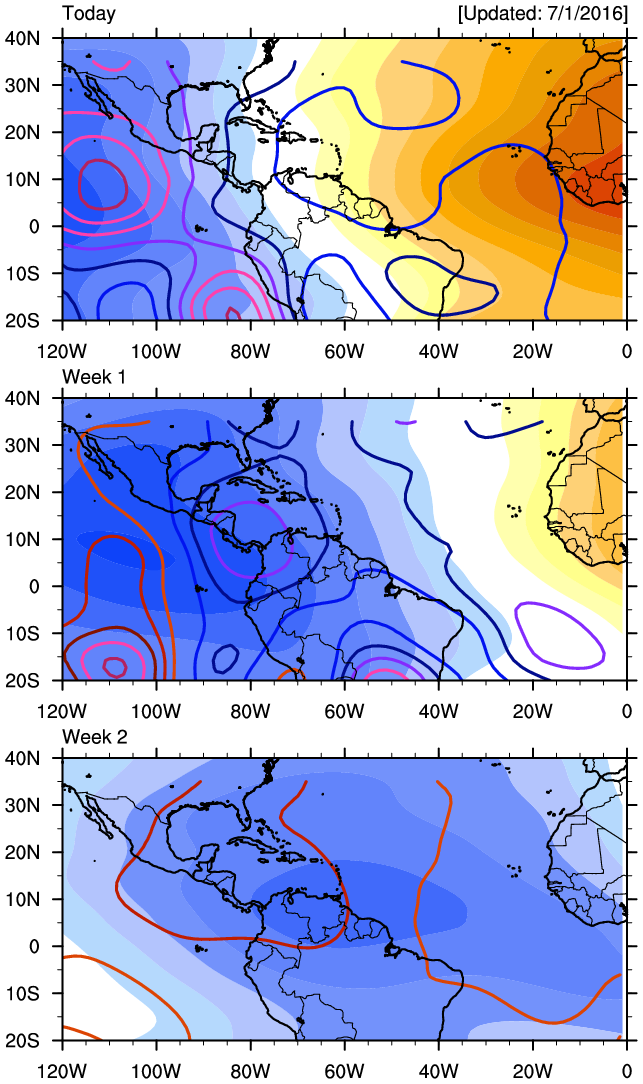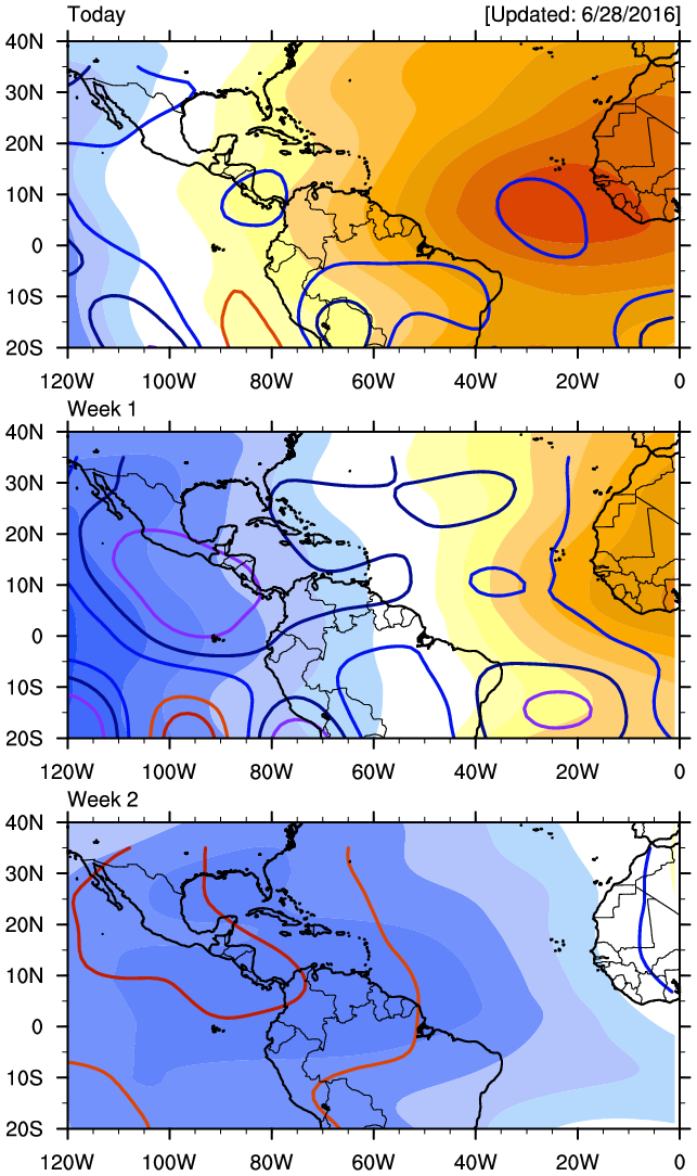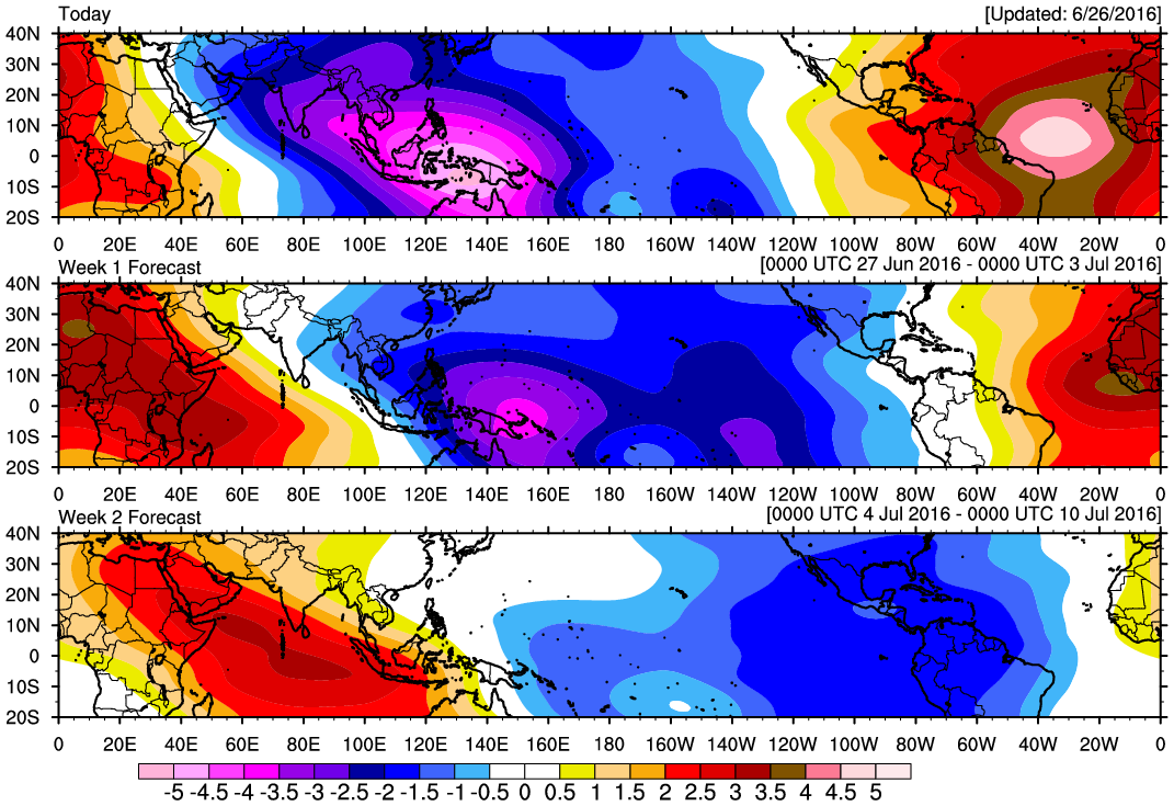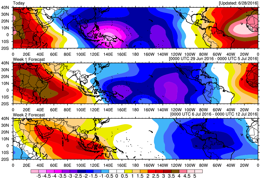 The robust Madden Julian Oscillation (MJO) Pulse continues its slow trek Eastbound and will likely assist in developing a couple of Tropical Cyclones in the Eastern Pacific over the next week or so as they safely move generally West away from land into the open Pacific. The Convectively Coupled Kelvin Wave appears somewhat stronger this morning over the Eastern Pacific lending to greater rising air and instability which will further assist in TC Genesis in the Eastern Pacific Ocean. Eventually around the mid July timeframe, those Hemispheric features will move far enough East to begin impacting the Western Atlantic Basin. Some of the longer range ensemble computer guidance suggest the Upper Ridge will retreat West over the SW United States and pressures begin to fall across the NW Caribbean Sea and the Western Gulf. We will continue to monitor for any potential tropical troubles as we begin the slow, but steady march toward peak Hurricane Season 2016 and hope all have a Safe and Happy Independence Day!