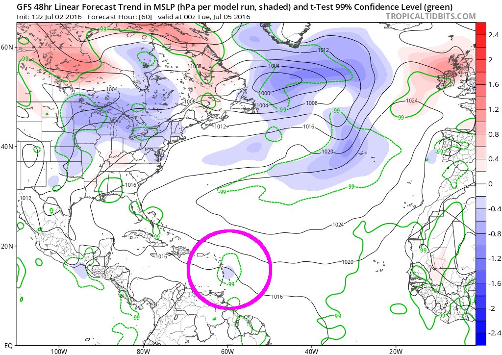 GFS short-term correction is toward a more vigorous tropical wave to move through Lesser Antilles on Monday: