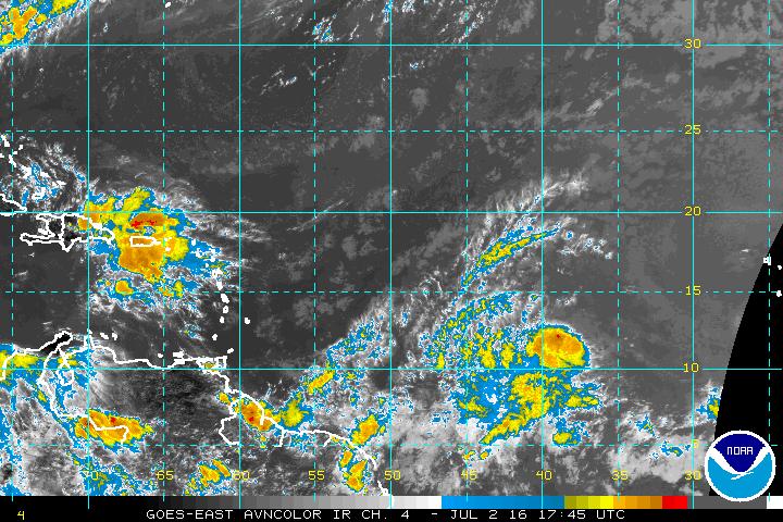 A sharp tropical wave continues to march West in the mean Easterly flow just W of 40 Longitude this morning and has some convection rather far South along the Monsoonal Trough/ITCZ. Another vigorous wave is in the Western Caribbean Sea moving Westbound with some embedded strong tropical thunderstorms, but no development is expected.