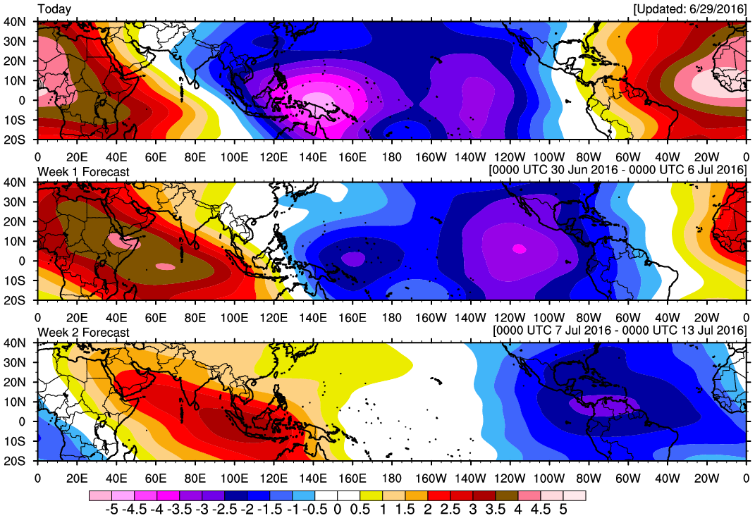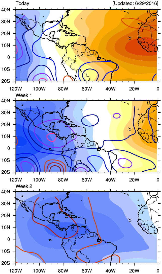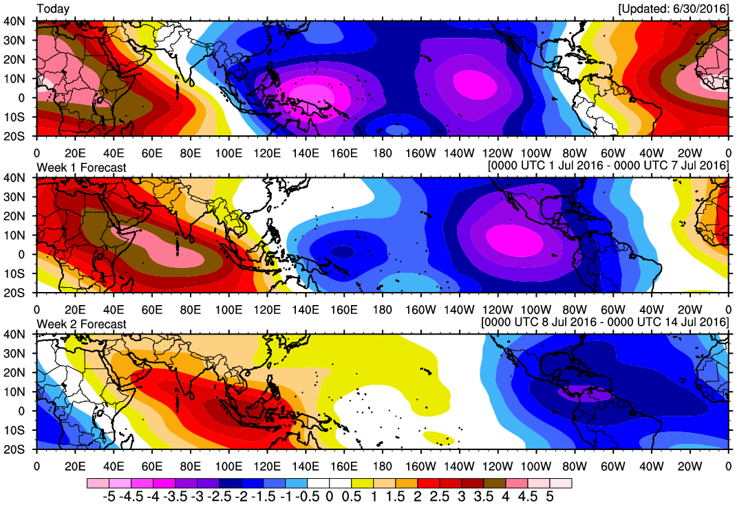 More importantly for our Region is the arrival of a very robust Madden Julian Oscillation pulse as well as a Convectively Coupled Kelvin Wave (CCKW) and the potential for Tropical development, particularly in the Western Caribbean and the Western Gulf of Mexico. Tropical waves continue to traverse East to West across the Atlantic with little fanfare due to sinking air and High Pressure, but conditions in the Western Atlantic Basin are expected to become favorable for potential tropical development as rising and unstable air from the MJO and less wind shear as La Nina conditions begin to impact the Global weather patterns. As the pattern looks rather active, I will add the link to our Hurricane Central Section as we are already monitoring any potential tropical troubles that may come our way as July begins.