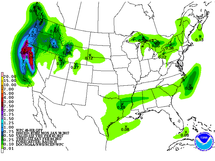 The overnight guidance suggests a stalling frontal boundary draped across Central Texas on Thursday will bring increasing clouds and the potential for some light rain Thursday afternoon into the early part of Super Bowl Weekend. It appears a shortwave with a attending Pacific frontal boundary may push across the area Super Bowl Sunday with a chance of showers and possibly a few thunderstorms, but the best chance for heavier rainfall appears to be NE of Metro Houston with local rainfall amounts of a quarter to a half inch possible for our Super Bowl festivities.