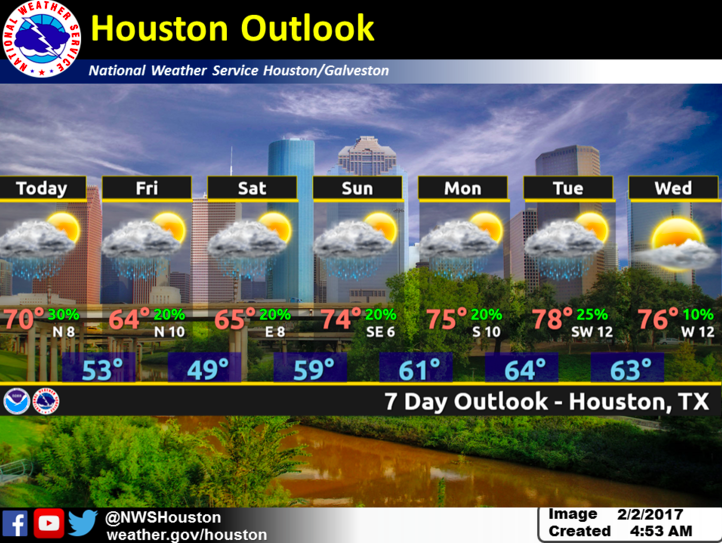 Cloudy skies, slightly cooler temps Friday and Saturday, and 20-30% of showers through the Houston Superbowl weekend.