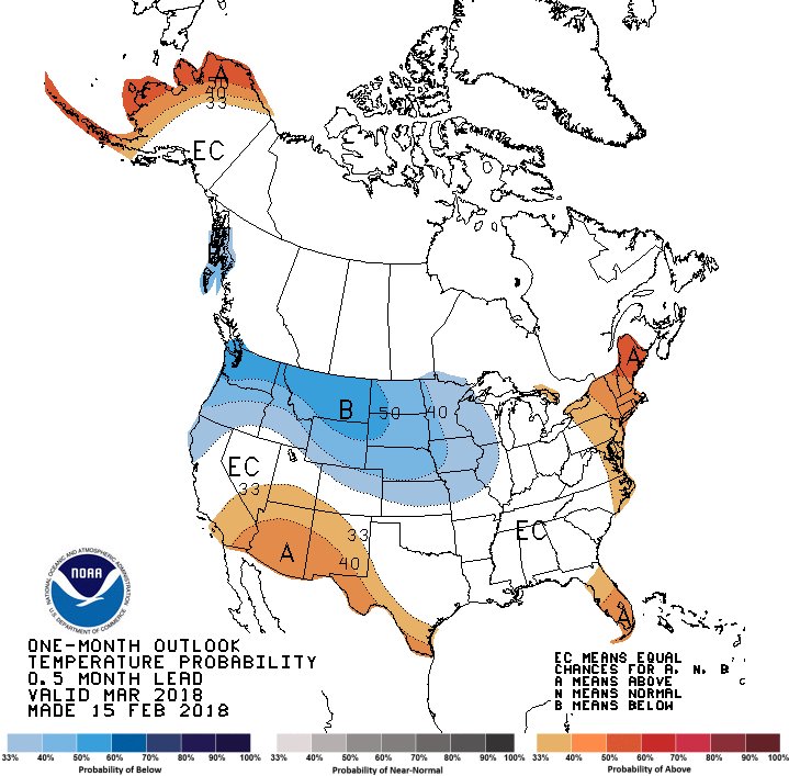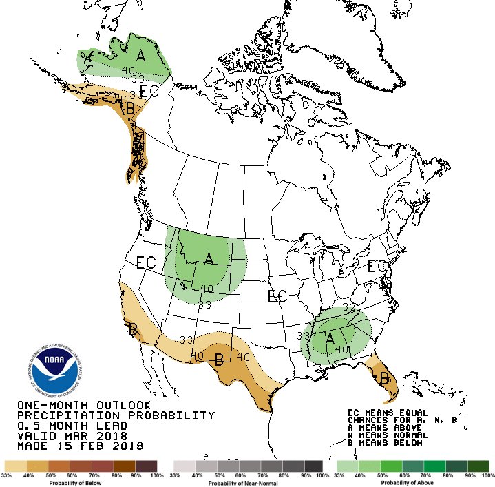 Odds are tilted towards warm and dry conditions in our forecast for March through May from California through the Southern Plains, which could intensify drought concerns for the region. http://www.cpc.ncep.noaa.gov/products/p ... php?lead=1 …