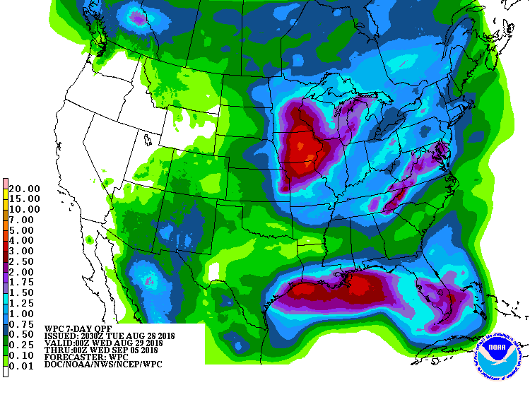 I see no change regarding our sensible weather as the Long Labor Day Holiday Weekend begins and ends. What you see out there today will likely be the same pattern we can expect during the Long Weekend. The 7 Day QPF charts paint an unsettled pattern with a series of inverted troughs moving West beneath the flattened out Upper Ridge across the Mid West into the Mid Atlantic.