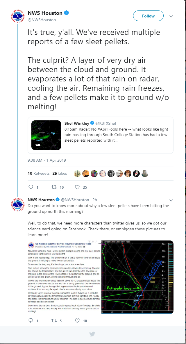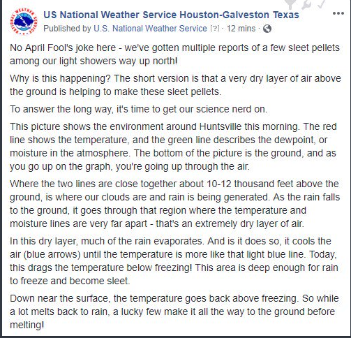 "No April Fool's joke here"... NWS Houston tweeted about several reports of sleet up near College Station.