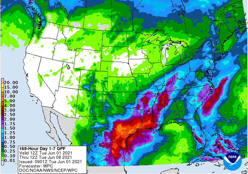 WPC 7-Day QPF forecast amounts for SE TX remain in the 4-5" range.